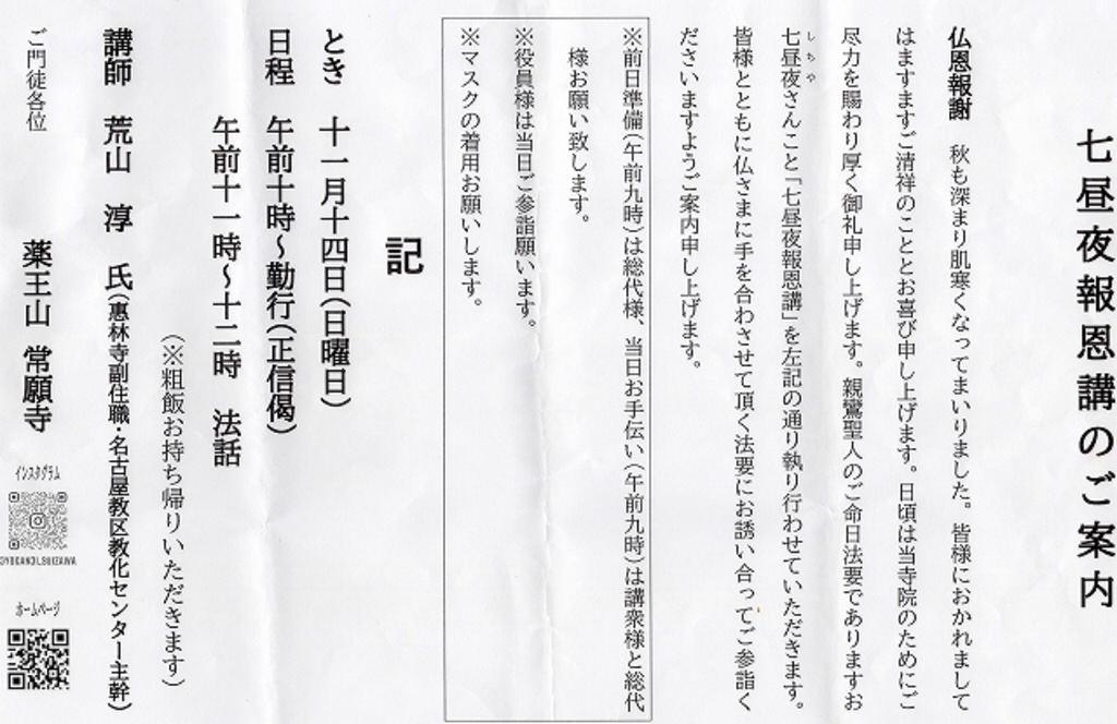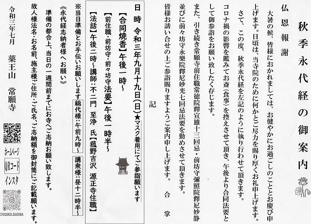 秋季永代経のご案内申し上げます。