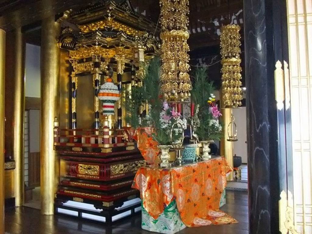 余間に親鸞聖人ご生涯をあらわされた四幅のお軸をかけてお荘厳しています。右のお軸→左のお軸へ、下から上にみていきます。出家9歳得度からはじまり、御入滅までが描かれています。