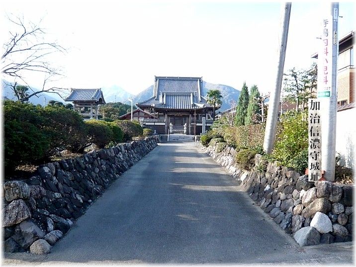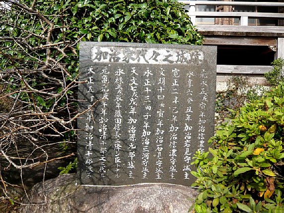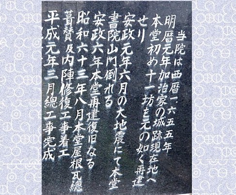 本堂手前に建つ石碑 本堂の手前には石碑が建ち、城と城主の歴史が刻まれている。 ![]() |