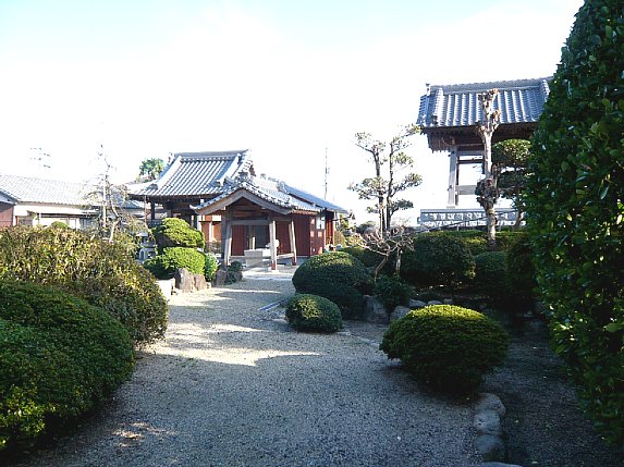 | 南側の土塁 本堂の横(南側)から裏手(西側)にかけては土塁がよく残っている。 南側の土塁は植栽で分かり辛いが、高さ2m以上あり、幅も広く立派で、 特に東先端部(写真左手前の方)は広く、鐘楼が建てられているが、 往時は物見櫓でも建っていたのであろうか。 ![]() |