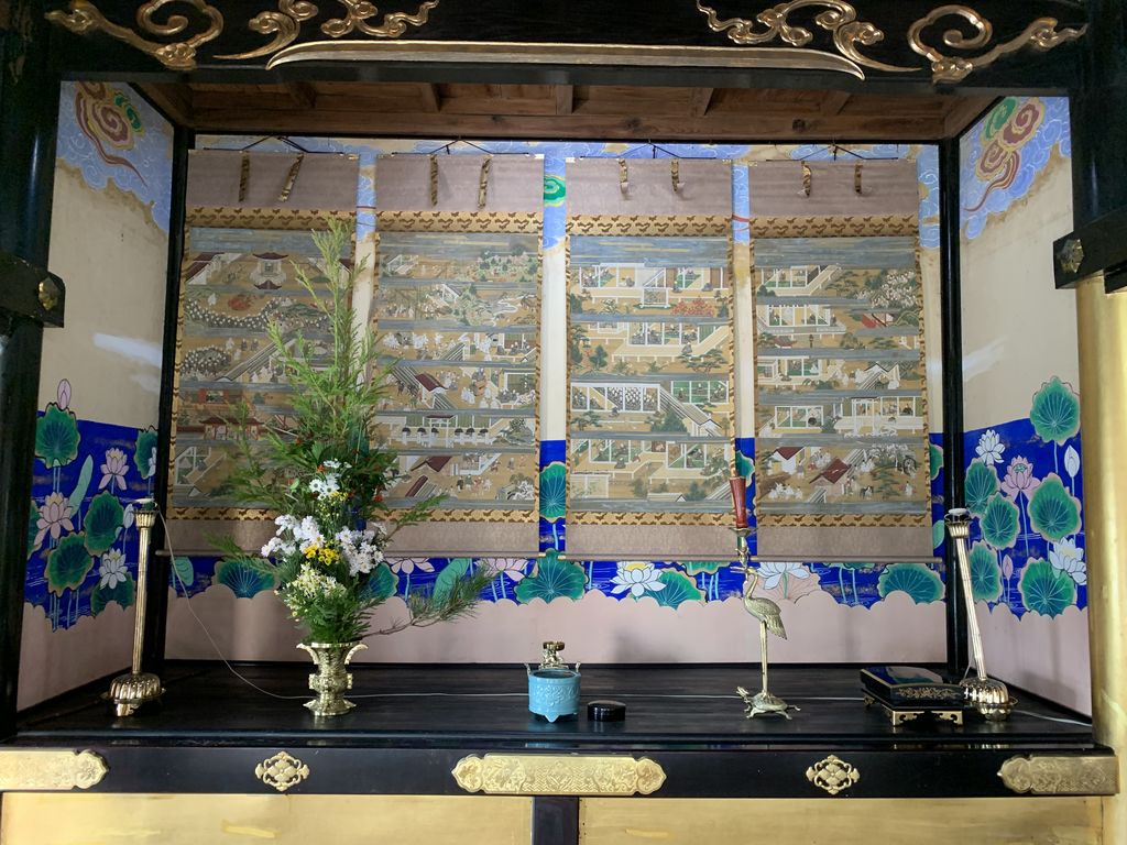 余間に親鸞聖人ご生涯をあらわされた四幅のお軸をかけてお荘厳しています。右のお軸→左のお軸へ、下から上にみていきます。出家9歳得度からはじまり、御入滅までが描かれています。