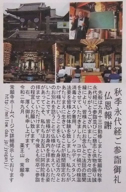 秋季永代経ご参詣お礼仏恩報謝のハガキを薬王山常願寺より頂きましたのでご紹介します。