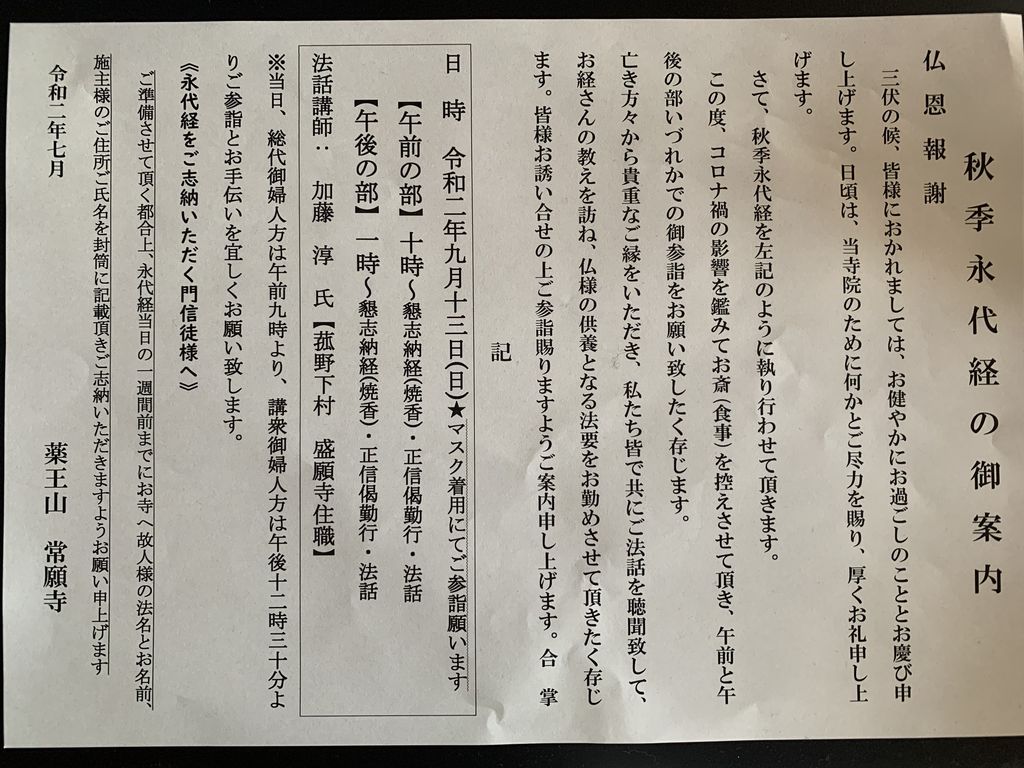 9月13日、午前と午後で分散法要を執り行います。是非いづれかの法座にご参詣ください。