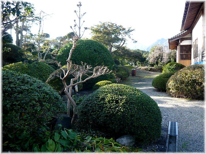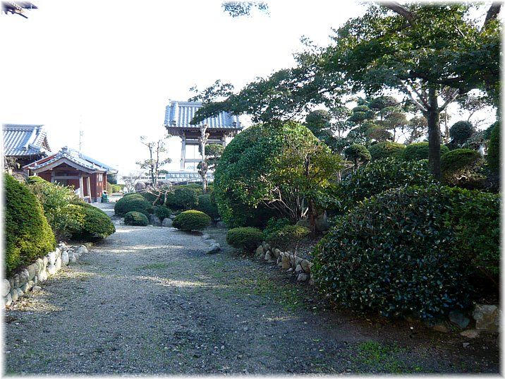 | 南側の土塁 本堂の横(南側)から裏手(西側)にかけては土塁がよく残っている。 南側の土塁は植栽で分かり辛いが、高さ2m以上あり、幅も広く立派で、 特に東先端部(写真左手前の方)は広く、鐘楼が建てられているが、 往時は物見櫓でも建っていたのであろうか。 ![]() |